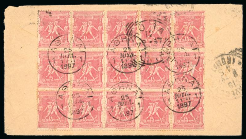 30 Lepta franking: 1897 (25 Jul) Envelope to Rome franked on reverse with a block of fifteen of the 2 Lepta cancelled by six Athens 1 cds plus a Roma arrival, envelope roughly opened on the front, remaining a fine multiple franking (Image)