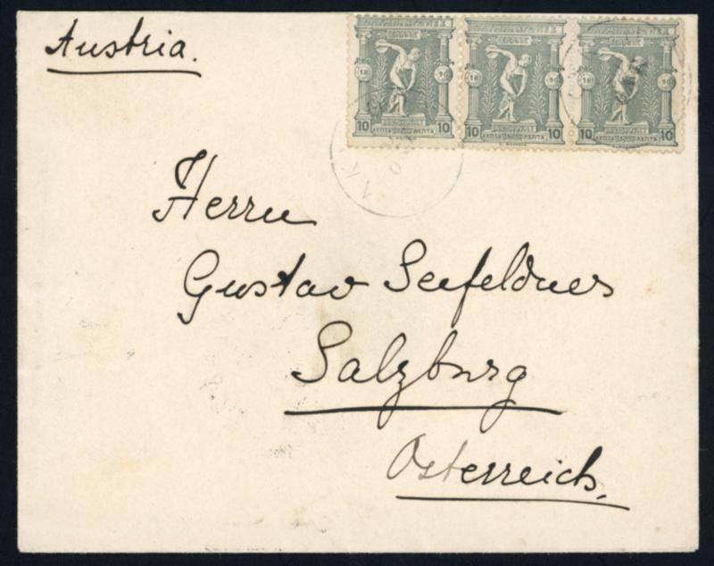 30 Lepta franking: 1896 unclearly dated envelope to Salzburg, Austria franked strip of three 10 Lepta tied unclear Zachynthos cds, reverse with Kerkira transit overstruck by arrival cds, was seal excised from envelope (Image)