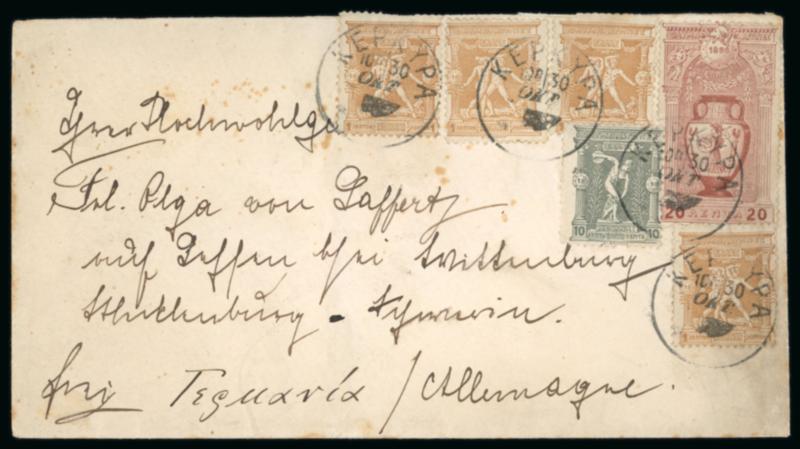 34 Lepta franking: 1896 (30 Oct) envelope to Wittenberg, Germany franked 1 Lepton (4) ,10 Lepta and 20 Lepta tied by Kerkira cds, arrival backstamp of 14.11., light vertical creasing clear of stamps, attractive (Image)