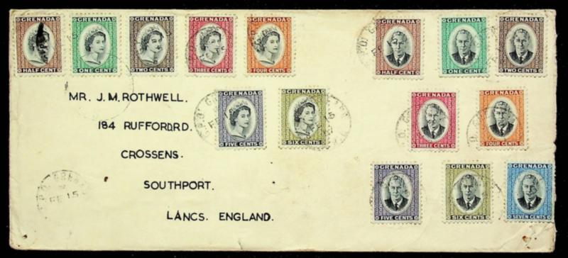 Grenada QEII, KGVI 15v on cover to Southport, Lancs. England (Image)