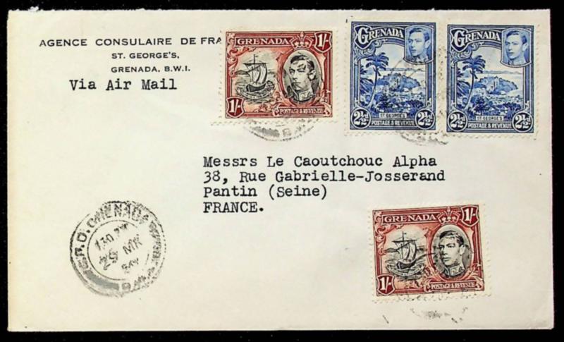 Grenada KGVI Pictorial issue 1shx2+ 2½dx2 on airmail cover to Pantin France (Image)