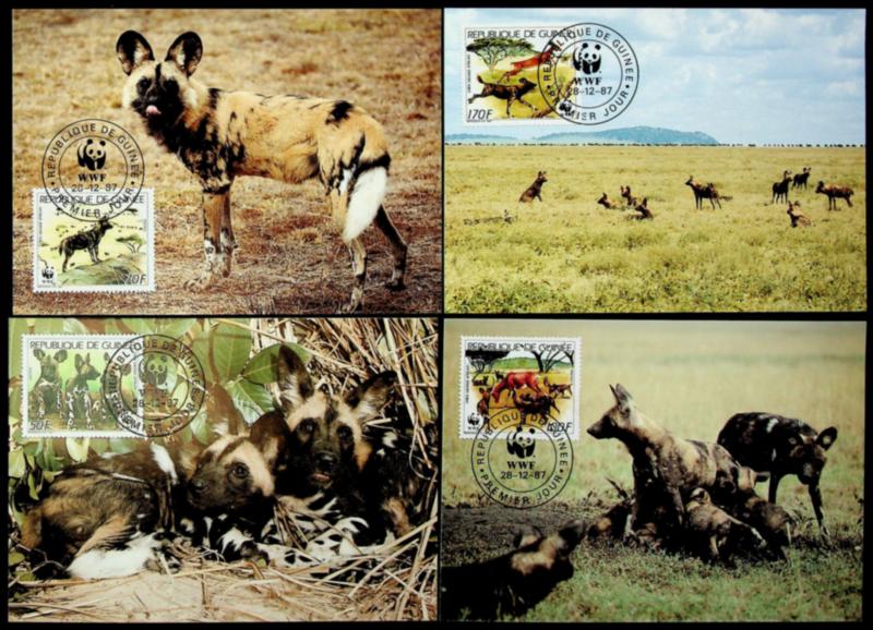 Guinea 1987 WWF Wild Dogs set of 4 Maxim Cards + FDC + MNH stamps (Image)