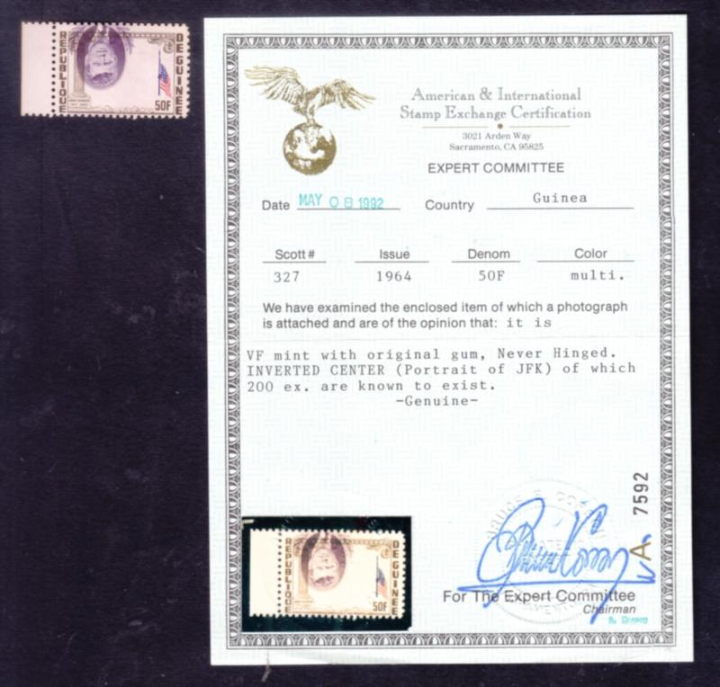 Guinea USA Portrait of JF Kennedy w/ Flag 50fx2 certified unused center inverted error variety stamps (Image)