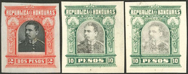Yvert 43 + 45, 1891 President Luis Bogran, PROOFS, the 2P. in different color on India paper and 2x 10P. in the issued colors, one with faint center, both printed on cardstock with glazed front, VF! (Image)
