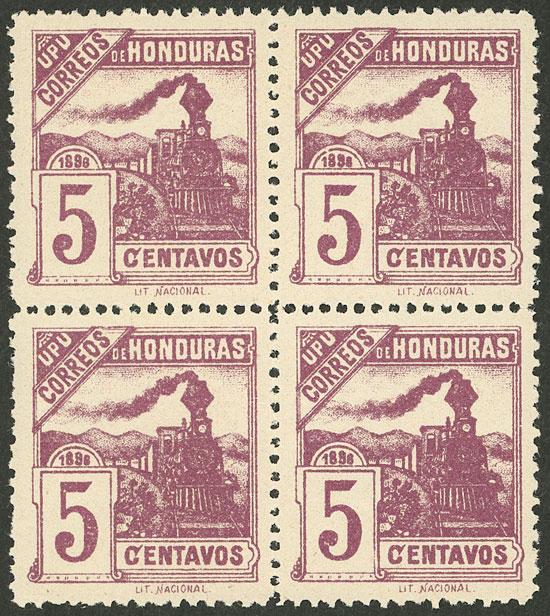 Yvert 86a, 1898 Train 5c., block of 4 with COLOR ERROR brownish lilac instead of gray-blue, MNH, excellent quality! (Image)