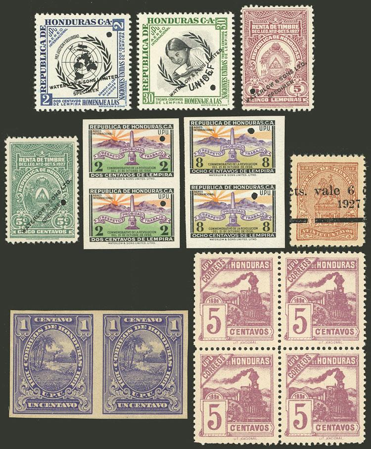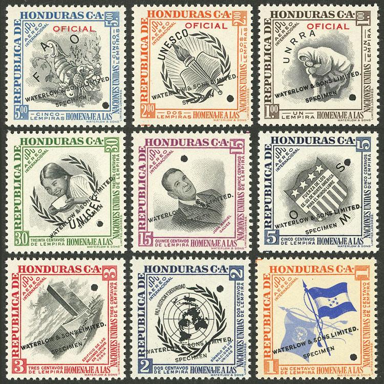 Yvert 31/39, 1954 United Nations, the set of 9 values with SPECIMEN overprint and name of the printer, and punch hole, excellent quality! (Image)