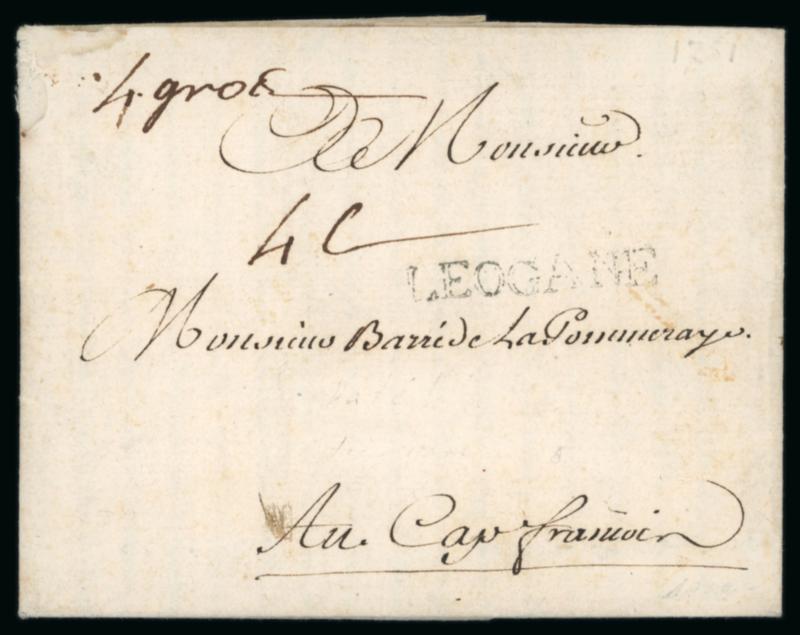 1761 (20 February) incoming entire from Nantes to Cap Français, the entire landed at LEOGANE with straight-line handstamp, reaching its destination by land, rated "4 Gros" on despatch and "4 E" (Escalines) on arrival, slight fault at top left of little consequence, scarce. (Image)