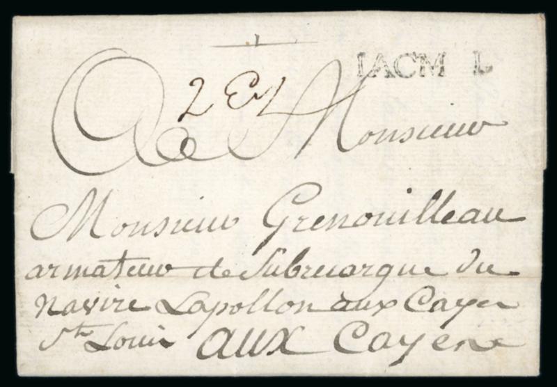 1772 Bordeaux to Aux Cayes entire, disembarked at Jacmel showing a straight-line handstamp without the "E" in JACMEL, light filing crease towards base, otherwise fine and clean. (Image)