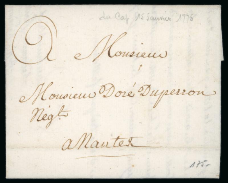 1775 (15 January) neat entire from Cap Haitien to La Nantes with manuscript endorsement on reverse "par Lamèriquain de St Malo / Capt Heuze" and "Q D C" Quem Deus Conservet (In God's Trust), without a charge; fresh clean condition with filing crease towards base. (Image)