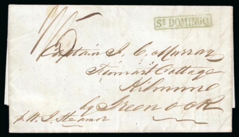 1843 (6 January) entire written from Cap Haitien to Greenock, Scotland, endorsed via Steamer and rated 1/5, this being the rate for unpaid letters from the West Indies, struck on arrival in Falmouth with an extremely fine framed St DOMINGO green handstamp, red framed arrival backstamp. An extremely fine example from the A.R. Murray correspondence to his parents; ex Glassco. (Image)