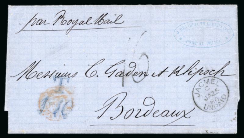 1874-80, Pair of entires with 1880 to Bordeaux, endorsed "Per Royal Mail" and bearing fine strike of JACMEL/ UNPAID date stamp in black, mailed via London where struck with "T / 1-10" in blue, taxed on arrival via Calais with handstruck '16' decimes, also with 1874 entire to Havre bearing very fine red JACMEL PAID. (Image)