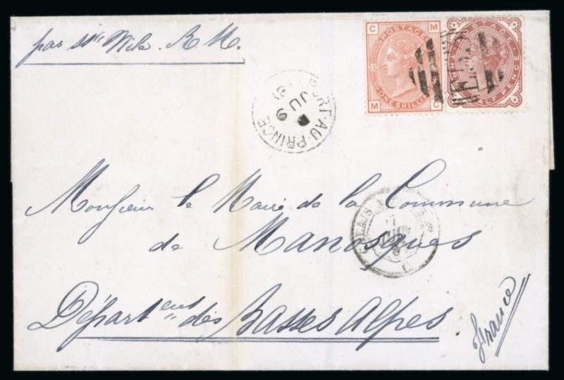 1881 (JU 9) outer letter sheet to Manosque, France franked 1880 1/- orange-brown and 1 1/2d Venetian-red cancelled by single E53 obliterator, Port Au Prince cds alongside, reverse with London transit (JU 27), Calais entry cancel of same date and arrival backstamp of the following day. Light vertical filing crease at left with some minor discolouration along it, still of fine appearance, late usage, the agency ceasing at the end of June. (Image)