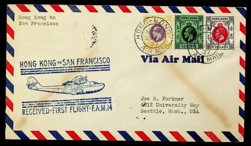 Hong Kong China 1937 KGV 3v on First Flight Airmail cover via San Francisco to Seattle Wash. USA (Image)