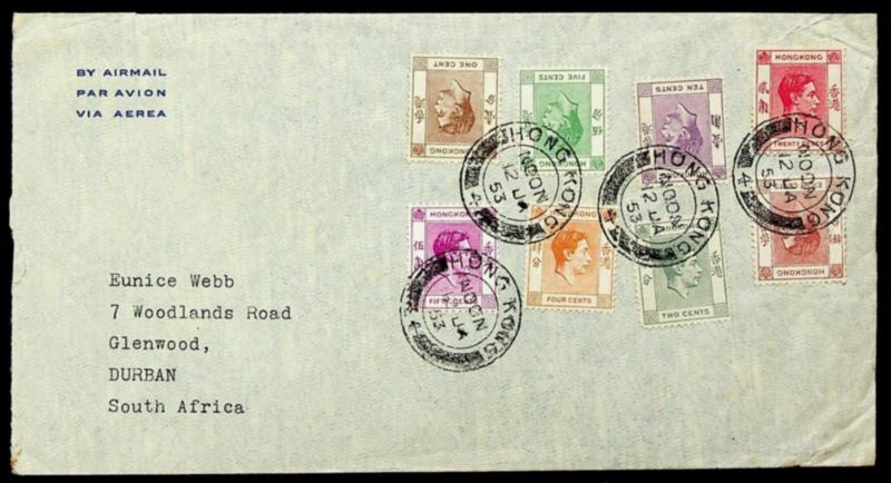 Hong Kong China 1953 KVI 8v on airmail cover to Durban South Africa w/ "Royal Interocean Lines" imprinted on flap (Image)