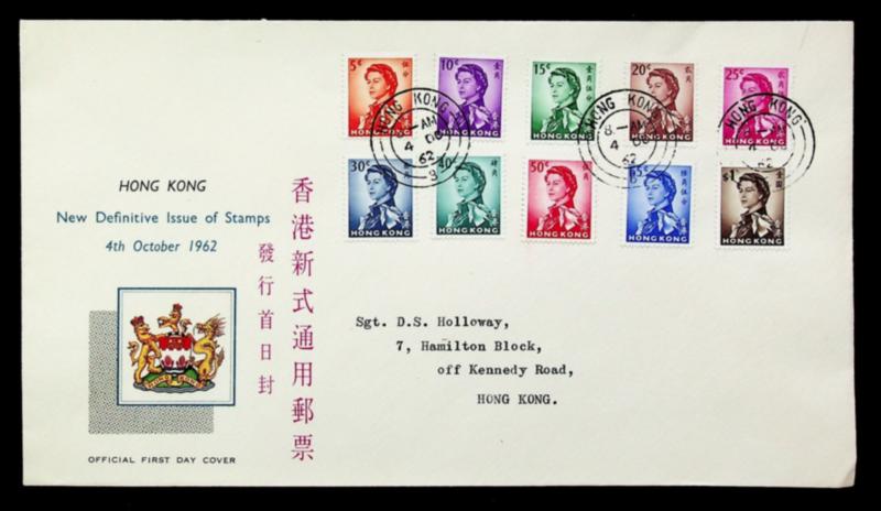 Hong Kong China 1962 New Definitive Issue QEII 10v of different colours FDC (Image)