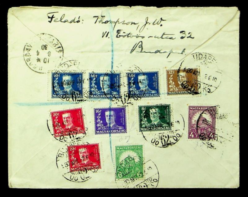 Hungary 1930 10v franked on back of Regd airmail cover from Budapest to Suffolk England (Image)