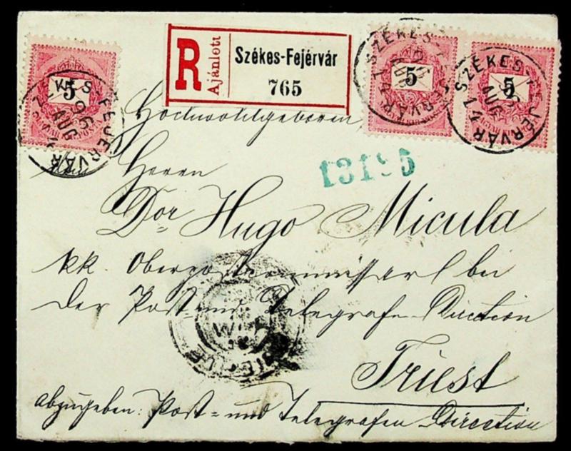 Hungary 1896 3v on regd cover from Szekes-Fejervar to Trieste Italy (Image)