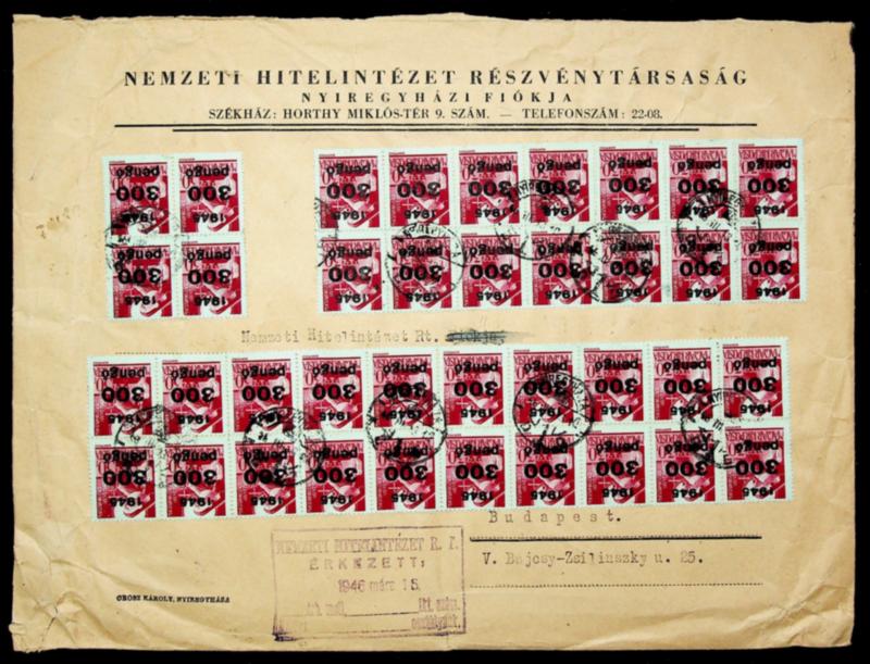 Hungary 1945 WWII 300 pengox99 s/c Inflation issue w/ multiples on both sides of cover from Nyiregyhaz to Budapest (Image)