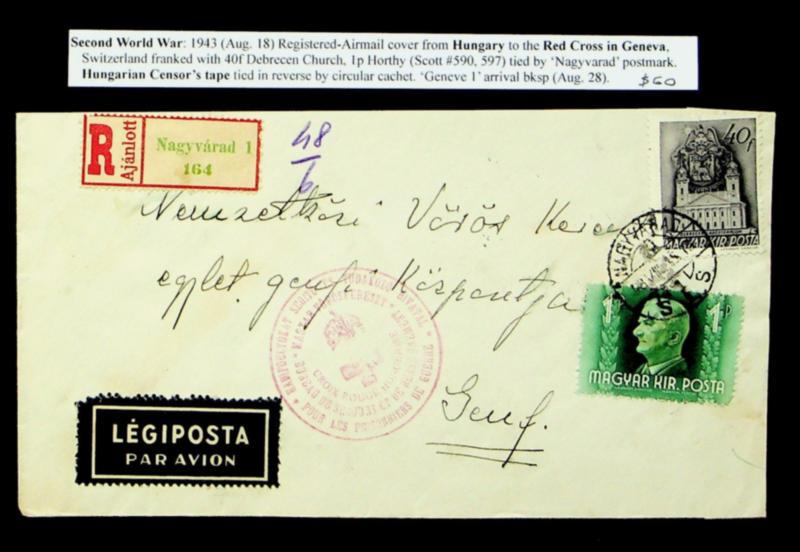 Hungary 1943 WWII 2v on censored Regd Airmail cover from Nagyvarad to Red Cross Geneva Switzerland (Image)
