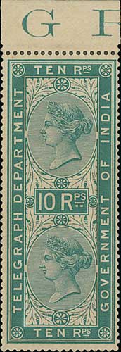 1869-78 10r Die II unmounted mint, upper sheet margin, gum toned, very fine appearance. S.G. T14, £1,200. Photo on Page 110. (Image1)