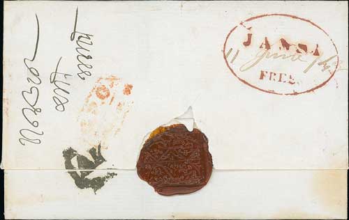 1843 (May 23) Entire letter to Calcutta, endorsed "On Service" and signed, reverse with fine red oval "JANSI / FREE" (Hammond Giles 1, recorded for 1842 only in his 1983 Supplement, manuscript date). A long detailed letter full of news of Indian politics and intrigue, rajahs, villains and campaigns, fine and scarce. Photo on Page 132. (Image1)