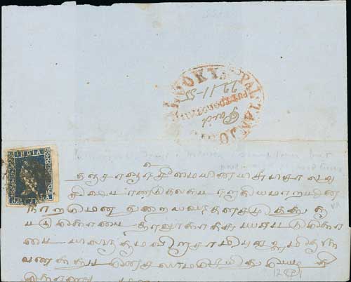 1855 (Nov 22) Entire franked 1854 ½a (badly torn before use) tied by a circle of bars (2 strikes), reverse with red oval "TANJORE / TALOOK TAPPAL / PUTTOOCOTTAH" ("Paid" and date in manuscript). Also an 1855 (Sep 19) entire letter with similar red oval handstamp of "TRIVADY", the stamps unfortunately removed. (2). Photo on Page 132. (Image1)