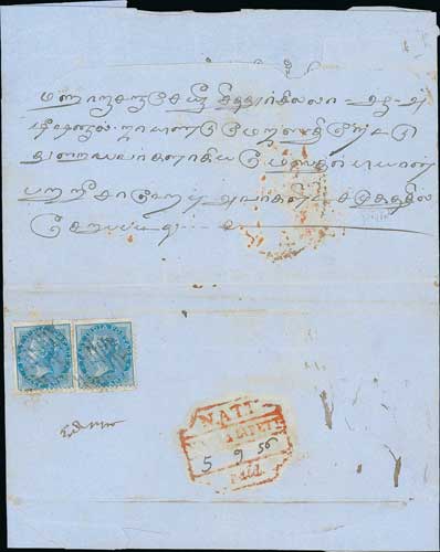 1856 (Sep 5) Entire letter, reverse with ½a pair each cancelled by a circle of bars and red chamfered corner handstamp "N.A.T.T / WALLAJAPETT / Paid", dated in manuscript, address panel a little reduced at upper edge and light crease passing through the stamps, otherwise fine and scarce. Photo on Page 132. (Image1)
