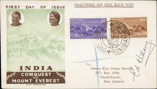 1953 (Nov 2) Conquest of Mount Everest illustrated First Day Cover, the two Everest stamps tied by special Bombay G.P.O first day cancels, sent registered air mail book post to New Zealand, signed by Edmund Hillary. Photo on Page 132. (Image1)