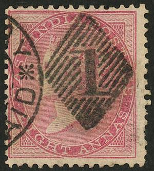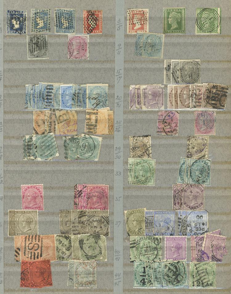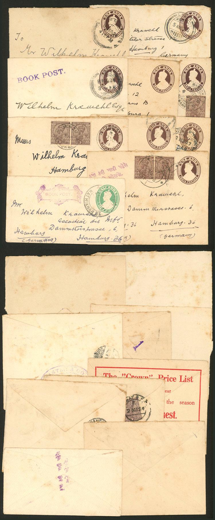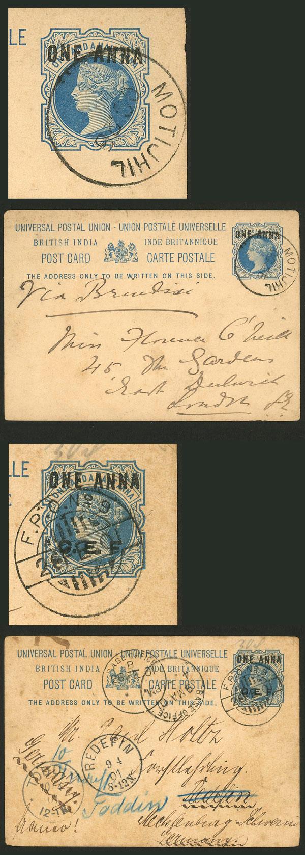 Couple of postal cards sent to London and Germany in 1899 and 1901, the former overprinted "ONE ANNA" and with cancel of Motijhil, the other one overprinted "ONE ANNE D.E.F." and cancelled "F.P.O.NÂș9" along other postal marks, very attractive lot! (Image)
