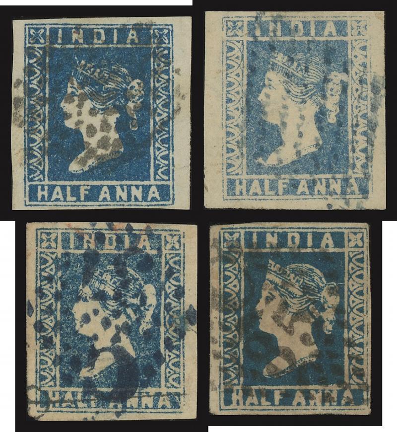 1854 East India Company ½a blue (shades) SG 2-10 group stated to comprise Die I in deep blue, Die II x2 in pale blue & in blue with largely very fine Numeral 'C/37' cancel in blue, and Die III in deep blue (small hinge thin at top) with largely very fine Numeral 'C/85' cancel in black, all with full margins (large in places), Cat £500+. (4) (Image1)