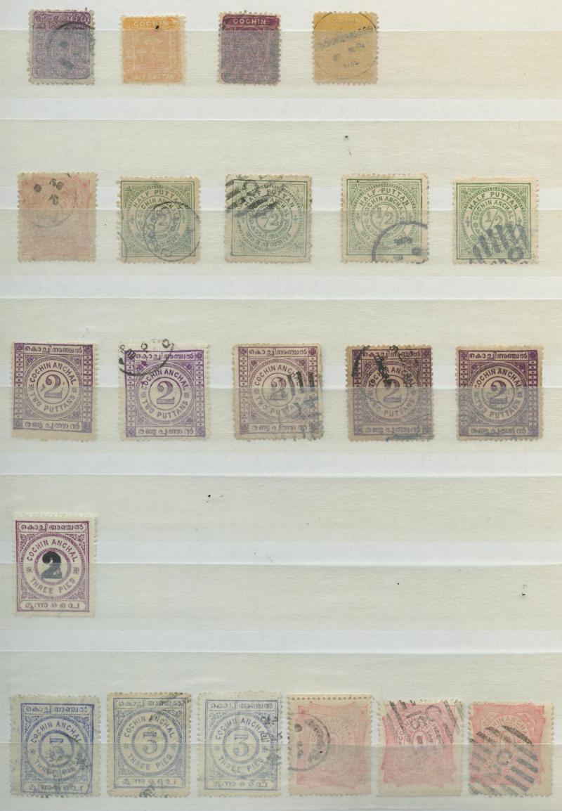 FEUDATORY STATES - COCHIN: Stockbook of duplicates with lots of shades, Surcharges and Officials, some postmark interest.