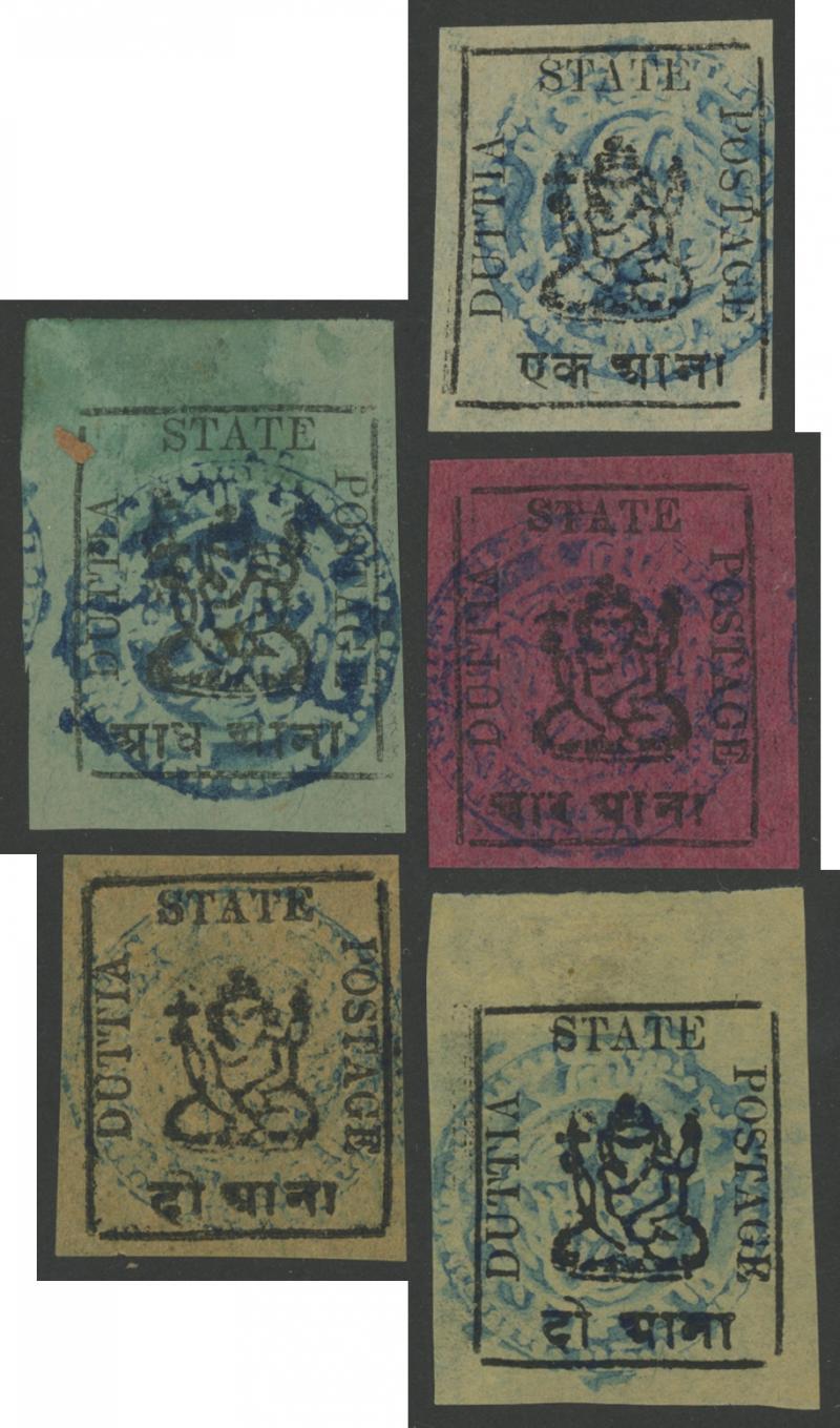 FEUDATORY STATES - DUTTIA: Group unused without gum as issued and with Control Handstamp in Blue including 1897-98 Thin Paper ½a (value in one word), 1a, 2a black/yellow & Pelure Paper 2a black/lemon and 4a, 1899-1906 Coloured Roulette ¼a brownish-red complete sheet of 16 (8x2) plus blocks of 6, 8 & 9 and ¼a pale rose part-sheet of 12 (6x2), ½a black/bright emerald Pelure Paper block of 6 (3x2), 1916 Imperforate ½a green complete sheet of 32 (8x4), also a couple of forgeries, some multiples with light folds between units, condition a little variable but most are fine to very fine, Cat £1500+.