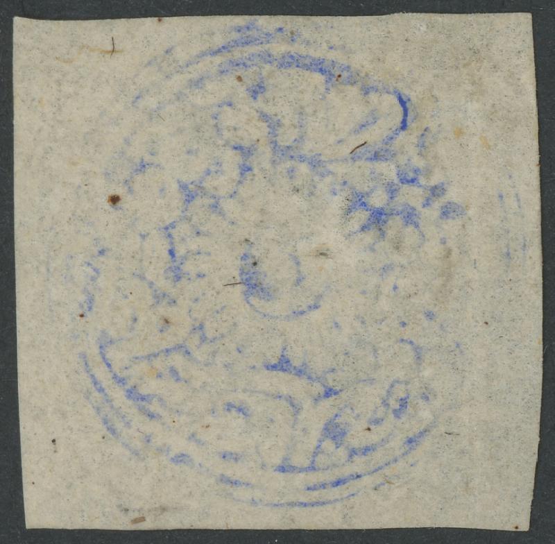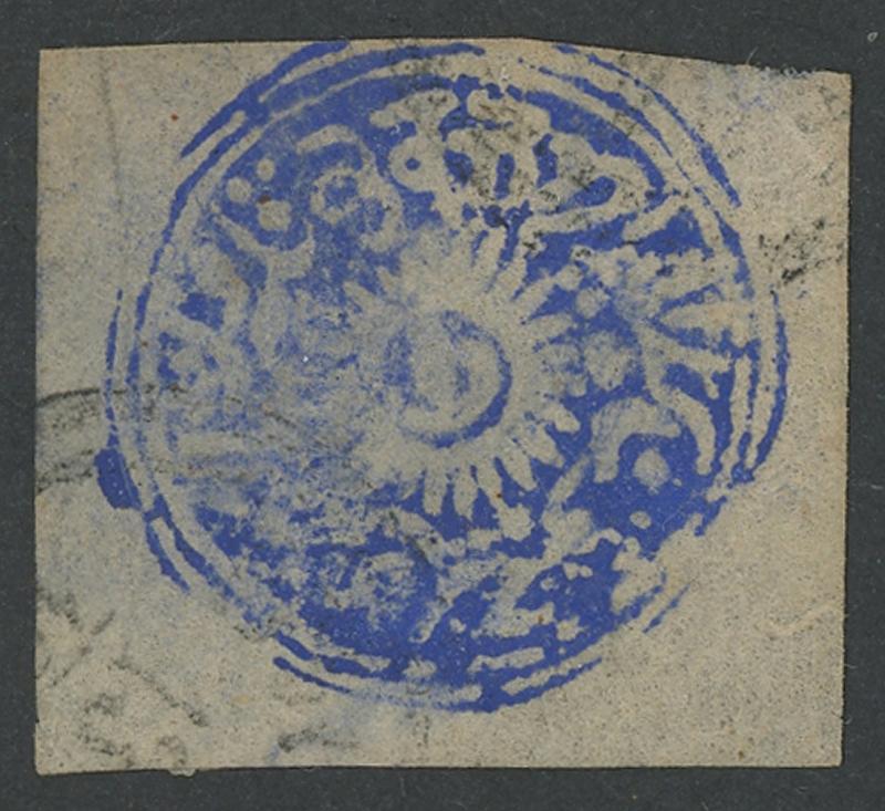 FEUDATORY STATES - JAMMU & KASHMIR: 1866 Circular Stamps Handstamped in Watercolours on Native Papers 1a ultramarine SG 3a, light impression, cut-square with margins close to large, pen annotations on reverse otherwise very fine, unused, without gum as issued, Cat £1700. ISES Certificate (2015). Neither the George S Harell nor the 'Uttama' Indian States sales included a cut-square example of this stamp. (Image1)