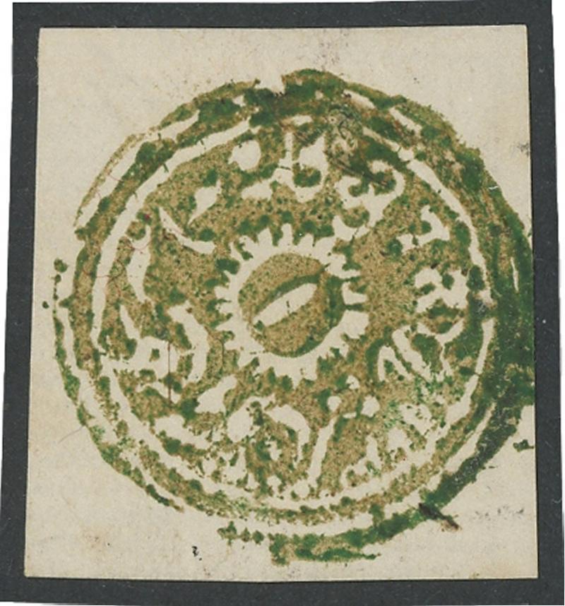 FEUDATORY STATES - JAMMU & KASHMIR: 1877 Circular Stamps Handstamped in Oil Colours on Thick European Laid Paper 4a sage-green SG 47, cut-square with three good to large margins and just touching the outer ring at right, two small ink annotations including the denomination "4" on reverse, unused, without gum as issued, Cat £3500. Stated to be ex Sefi-Pemberton. ISES Certificate (2024). The George S Harell example - also just touching at right - sold in 2013 for £1680 (when catalogued at £2000). (Image1)