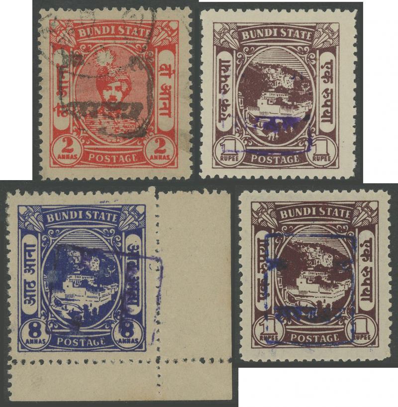 FEUDATORY STATES - RAJASTHAN: 1948-49 Handstamped in black on Bundi Pictorials 1a-8a (4a used), Handstamped in Violet 1a-1r and Handstamped in Blue ¼a ½a 1a 8a & 1r, plus Overprinted in Black 2a-1r SG 1A-7C (ex 4C & 5C) & 11-14, very lightly mounted with a few unmounted, generally fine to very fine, none are expertised so offered strictly 'as is', Cat £1950+.