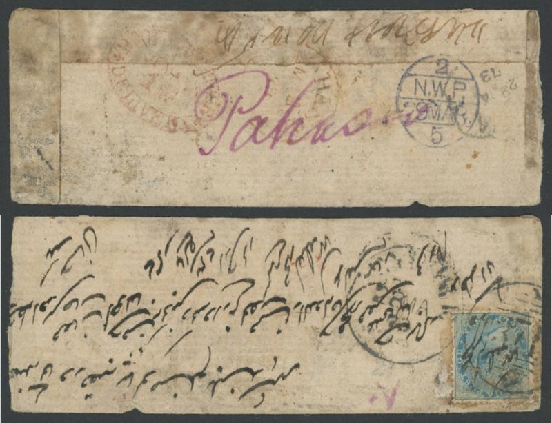 POSTAL HISTORY: 1873 native envelope from Rajasthan to Bulandshahr (Uttar Pradesh) with East India QV ½a blue tied by Jaipur '371' duplex cancel, carried by train with very fine North West Provinces Travelling Post Office '2/N.W.P.' upright-oval transit (Renouf type 129) on reverse alongside '.../DELIVERY' arrival in red, a few minor faults but still quite presentable. (Image1)
