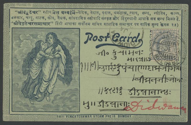 POSTAL HISTORY: 1900s batch of advertising postcards including illustrated types noted Statue of Liberty, Trimurti and other gods & myths most with 'stamp collars' and KEVII 3p grey for local use, variety of firms noted 'Bargain Merchant Opium Shop', potential postmark interest, also Postal Card QV 1a blue to USA with 'SEA POST OFFICE/C/BOMBAY-ADEN' cds, plus Jaipur 1913 postcard with Chariot ½a green solo, folded outer franked on the reverse with Chariot ½a blue x2 (one stamp with the '1/3' value error) and 1949 usage of Postal Stationery Envelope 1a blue with Maharaja Sawai Man Singh II overprint, condition a little variable some with small faults. Fascinating group.