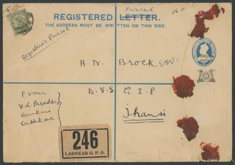 POSTAL HISTORY - GWALIOR: 1931 Overprinted KGV 1s+2a Registration Envelope (225x160mm) with 'LETTER' crossed- through & endorsed "Registered Parcel", 'GWALIOR' 4a tied by poor Lashkar cds, black/pinkish 'LASHKAR GPO' parcel label, internal usage to Jhansi (poor arrival backstamp, small opening faults on the flap. A very unusual item between two adjacent towns. (Image1)