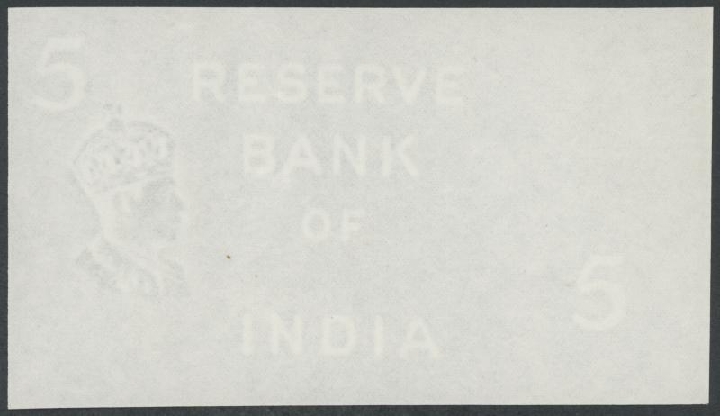 1937-43 KGVI 5 rupee watermarked paper (128mm x 72mm) '5/[king]/RESERVE/BANK/OF/INDIA/5', EF.