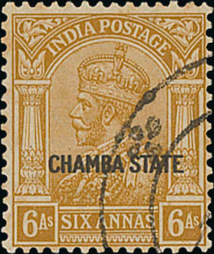 Chamba. 1937 KGV 6a, watermark inverted, small "CHAMBA STATE" overprint, fine used. This KGV 6a was not issued until 1937 and was replaced by the KGVI issue in 1938, the key value in the set. S.G. 72, £225. Photo on Page 126. (Image1)