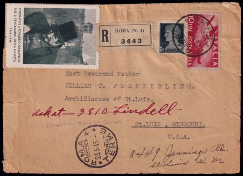 RE DI MAGGIO. Busta raccomandata spedita da Roma per St. Louis USA il 23/5/1946 ed affrancata con eccezionale combinazione composta dal 10 lire di posta aerea di Repubblica italiana unitamente all'alto valore da 25 lire della serie Imperiale del Regno d'Italia in uso estremamente tardivo ma tollerato. Timbri di transito e arrivo il 5/7/46. Massima rarità della collezione luogotenenziale. (Image)