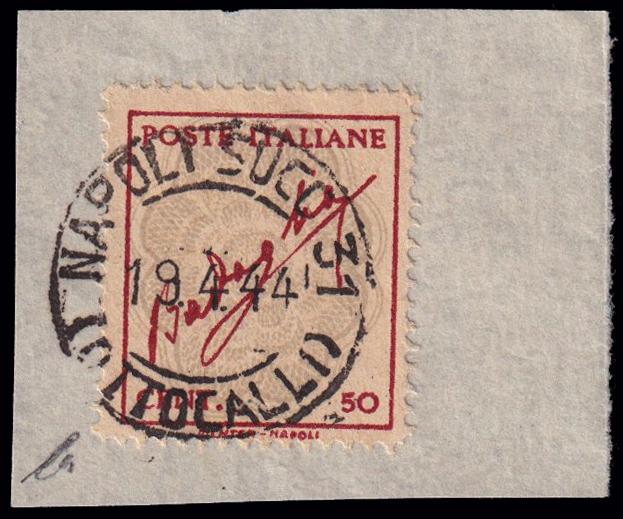 BADOGLIO - ERRORE DI COLORE DEL FONDO DI SICUREZZA. Esemplare da 50 centesimi rosso e grigio anzichè bistro (n.515Hc), annullato su frammento. Pochissimi esemplari noti. (Image)