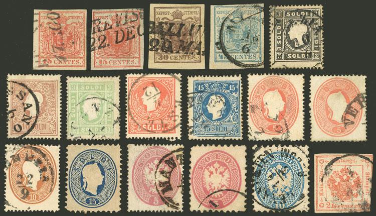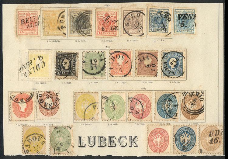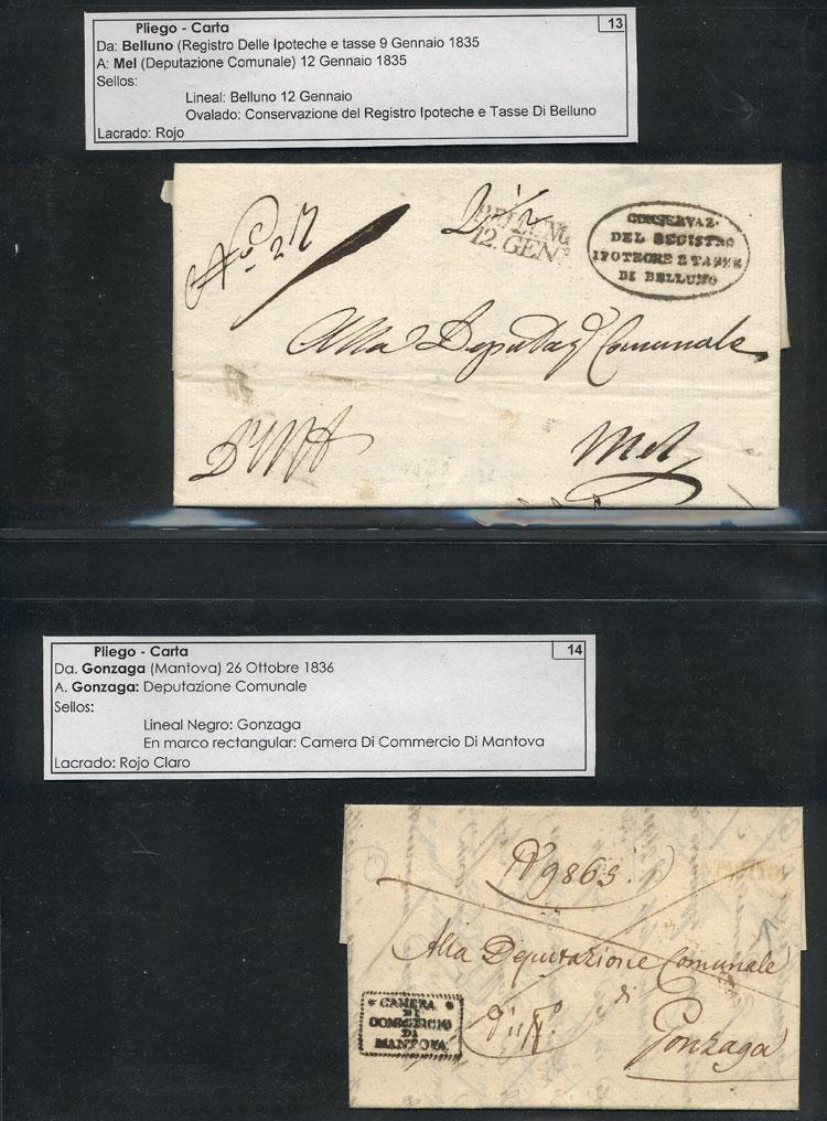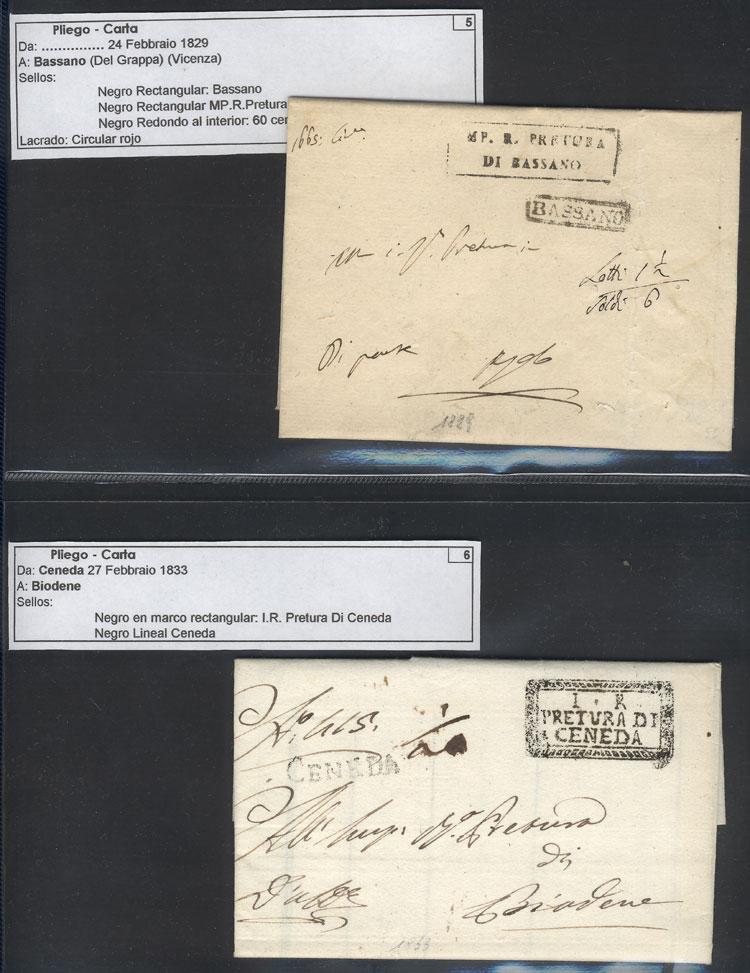 Collection of 38 letters with pre-stamp markings and stampless letters (used between 1809 and 1884), in general of excellent quality, with varied marks of: Ferrara, Bergamo, Milano, Bassano, Ceneda, Vicenza, Trieste, Fonzaso, Rovigo, Udine, Latisana, Mel, Belluno, Asolo, Camposampietro, Feltre, Moncalfone, Valdobbiadene, Agordo and Trichiano (one stamp missing in the latter). Very interesting for the specialist! (Image)