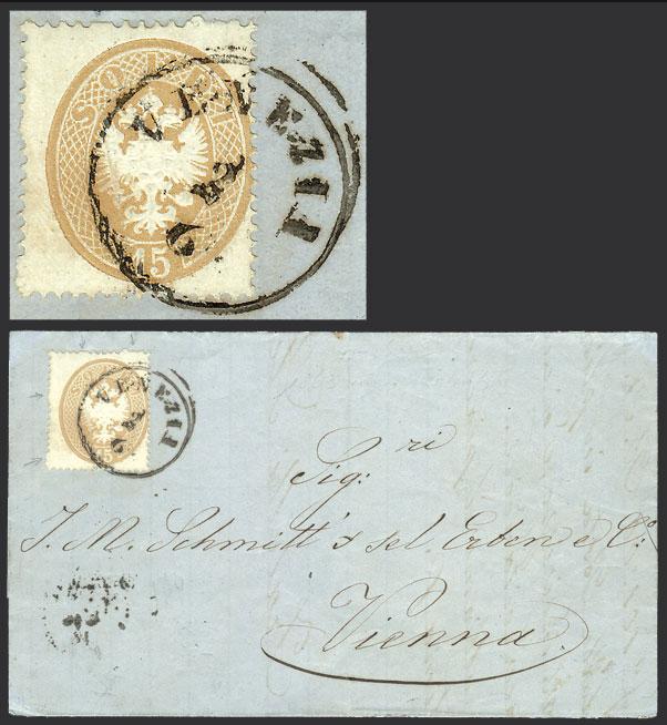 Entire letter dated VENEZIA 2/JUN/1864, franked with 15s. yellow-chestnut of 1863 (Sc.19) with perfect datestamp of Venezia, and Wien arrival backstamp, excellent quality, catalog value US$1,000. (Image)