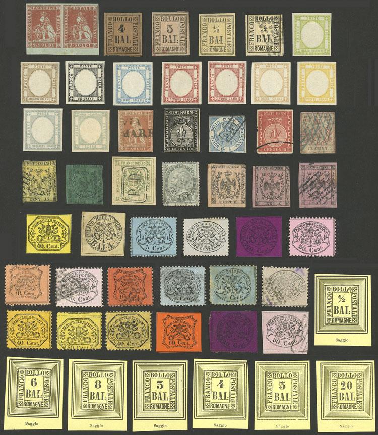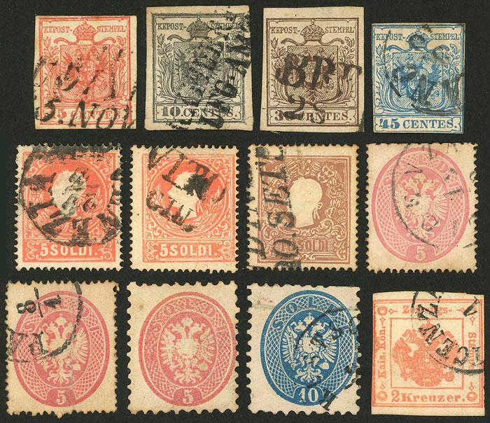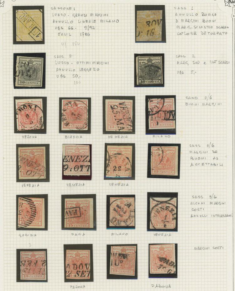 Collection of 56 letters with pre-stamp markings and stampless letters (used between 1846 and 1872), in general of excellent quality, with varied marks of: Mantova, Milano, Isola Della Scala, Conegliano, Valdobbiadene, Mestre, Villano, Castelfranco Veneto, Agordo, Belluno, Gonzaga, Legnano, San Donà, Santa Croce Miglina, Rovigo, Longarone, Padova, Vicenza, Ceneda, Feltre, Auronzo, Pieve di Cadore, Mel, San Benedetto Po, Viadana, Cittadella, Ostiglia, Marostica, Lonato, Serravalle Po, Battaglia, Venezia, San Pietro Incariano, etc. Very interesting for the specialist! (Image)