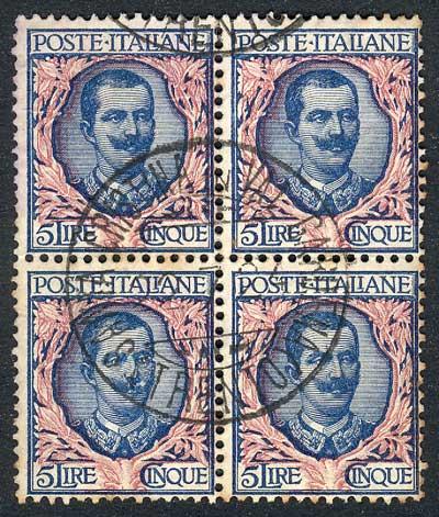 Sc.91 (Sa.78), 1901 5L. used BLOCK OF 4 of very fine quality, cancel of SANTA CRISTINA IN VAL GARDENA (Trento), very pretty, Sassone catalog value Euros 110. (Image)