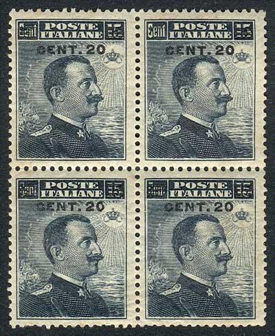 Sc.129 (Sa.106), block of 4, mint never hinged with variety: "Bars over Cent partially missing in the top stsamps", VF, catalog value US$180+ (Image)