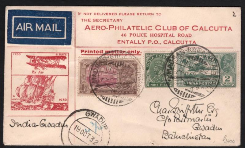 India 1932 Rare Madras-Karachi special format airmail cover to Guadur Baluchistan (Image)