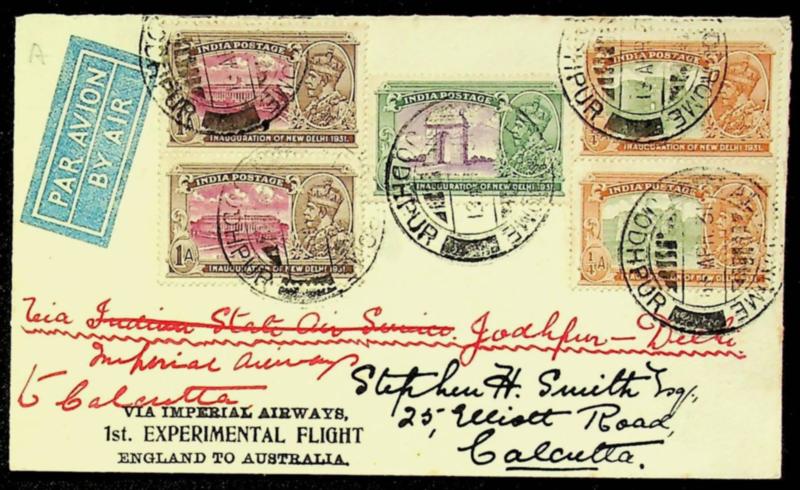 India 1931 KGV 5v on Imperial Airways 1st Experimental Flight England-Australia signed cover from Jodhpur to Calcutta via Delhi (Image)