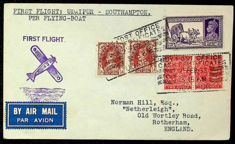 India 1938 5v on Coogee Flying Boat Airmail FFC from Udaipur to Southampton England w/ slogan cachet & GB KGVI ½d at back (Image)